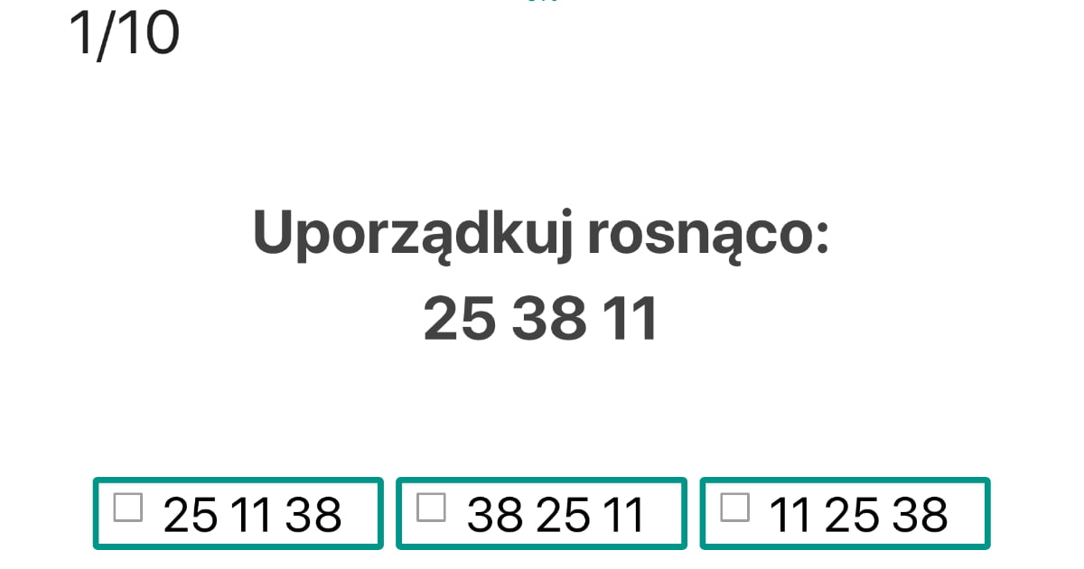Mamy do zaproponowania ćwiczenie online polegające na uporządkowaniu liczb rosnąco w zakresie od zera do pięćdziesięciu. Dziecko wybiera opcję, w której według niego odpowiednia kolejność została zachowana. Ten interaktywny quiz z możliwością pobrania odpowiedzi w wersji PDF jest nowoczesnym odpowiednikiem standardowych, wydrukowanych matematycznych kart pracy dla klasy 1. Proste polecenia i krótkie zadanka zachęcają pociechy do wypełniania testu. To zadanie zostało przygotowane specjalnie dla uczniów klas pierwszych, drugich i trzecich. Jeżeli najmłodsi rozwiązują te ćwiczenia samodzielnie, to są w stanie poznać prawidłowość swojego wyboru tuż po jego dokonaniu. Serdecznie zapraszamy do skorzystania z naszego quizu jest on całkowicie darmowy! Wystarczy wejść i rozwiązać.