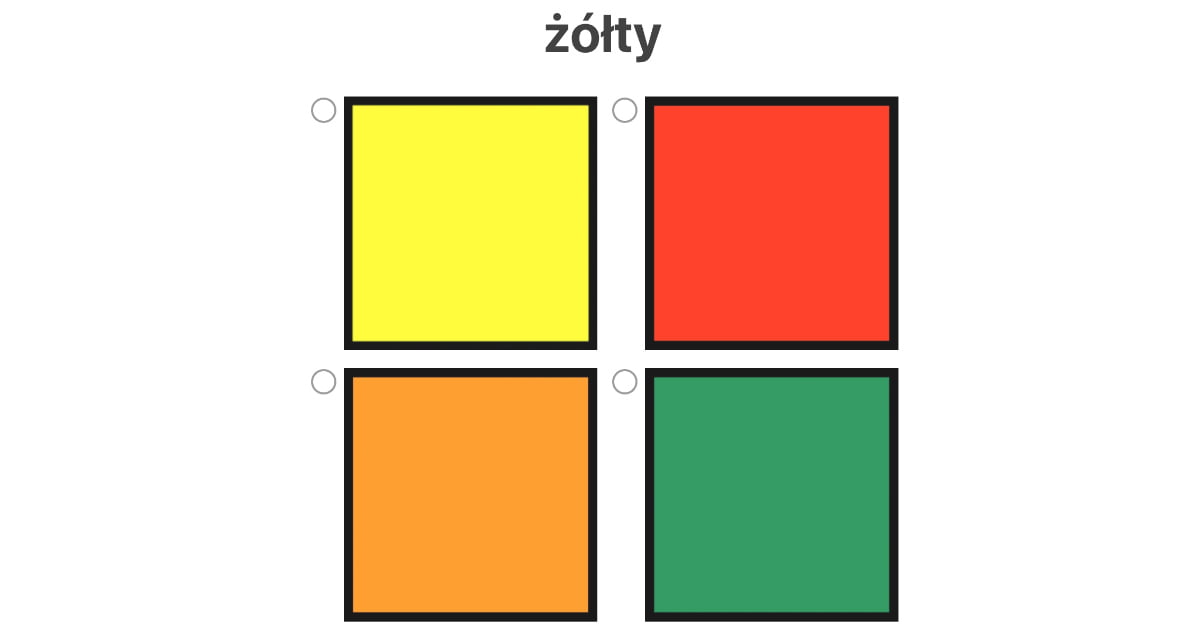 Właśnie trafiłeś na ćwiczenie na bardzo podstawową umiejętność – rozpoznawanie kolorów. Pozornie proste zadanie, które może być niezwykle pomocne w początkowym etapie edukacji podopiecznych, których językiem ojczystym nie jest język polski. Również jeśli dziecko ma wadę wzroku quiz ten może okazać się niezwykle przydatny. Ponieważ zadanie polega na tym aby wskazać jaki kolor napisany jest nad obrazkami może być potrzebna pomoc rodzica lub nauczyciela.