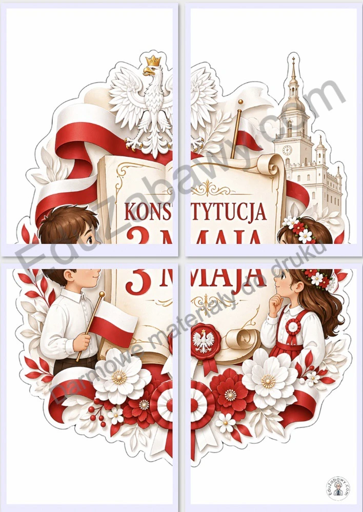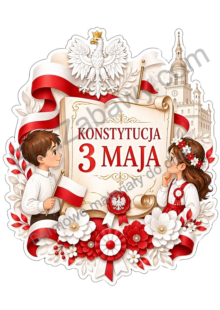 Dekoracja „Konstytucja 3 Maja” to elegancki materiał patriotyczny do druku, który sprawdzi się jako główny element gazetki szkolnej, dekoracja sali lub ozdoba na akademię. Kompozycja nawiązująca do jednego z najważniejszych świąt państwowych pomaga wprowadzić uczniów w temat i nadaje całej przestrzeni uroczysty charakter. To dekoracja, która łączy estetykę z czytelnym przekazem, dlatego świetnie nadaje się zarówno do przedszkola, jak i do szkoły podstawowej. Materiał można wydrukować za darmo w PDF do druku, a także wydrukować w wersji XXL, jeśli potrzebna jest większa dekoracja na korytarz, scenę lub tablicę. To piękna i nowoczesna ozdoba na 3 maja.