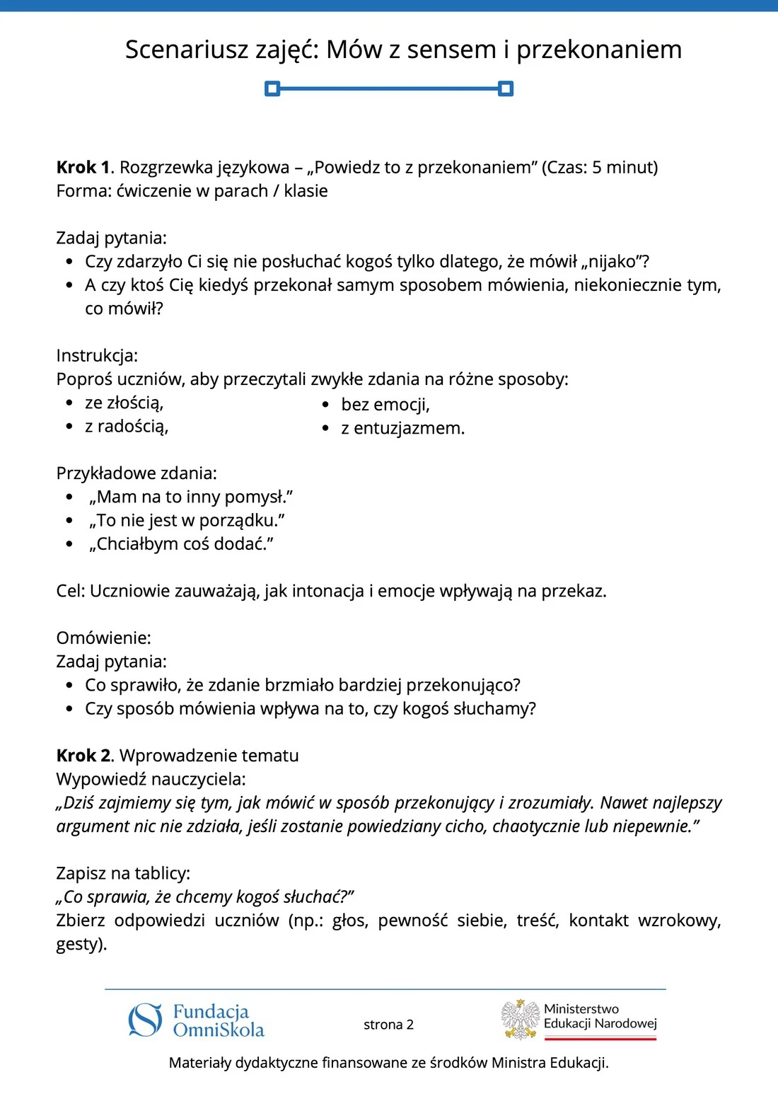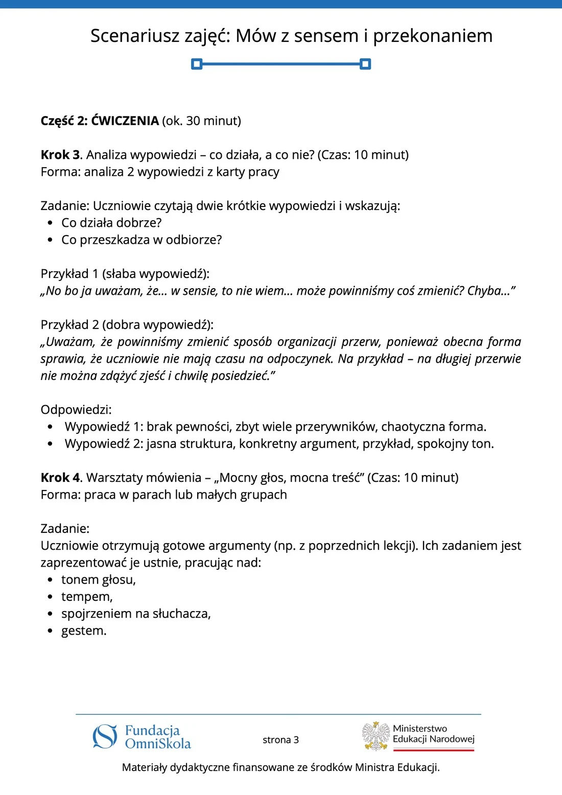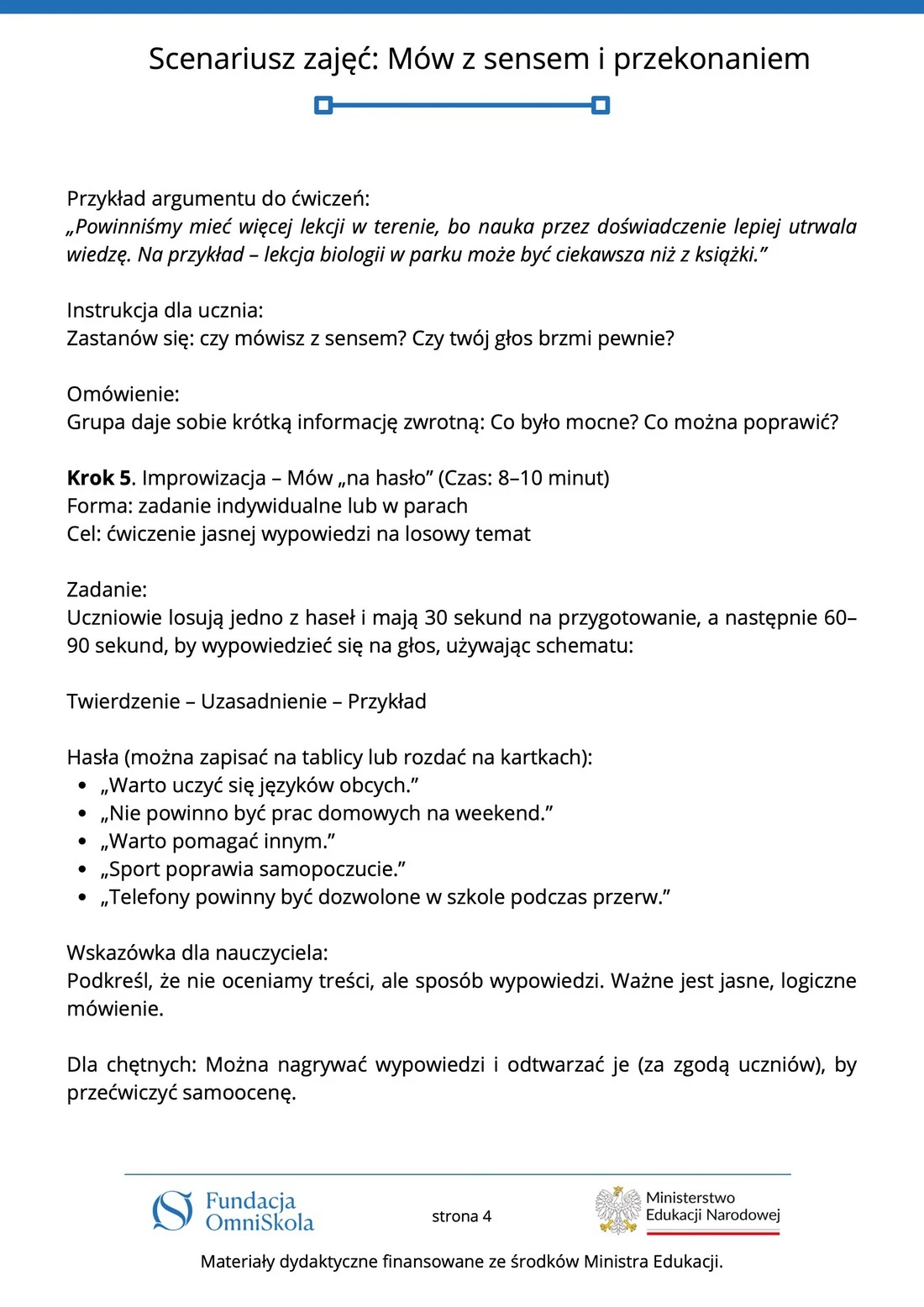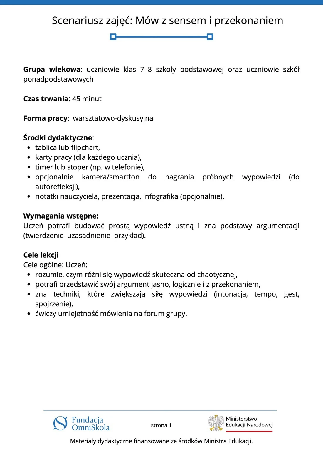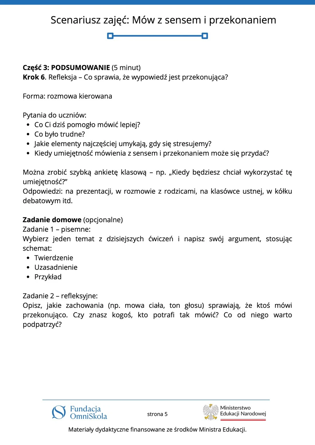 Tutaj znajdziesz komplet materiałów edukacyjnych przygotowanych przez Fundację OmniSkola – kartę pracy, scenariusz zajęć, infografikę oraz wideoprezentację. Dzięki nim uczniowie dowiedzą się, jak mówić jasno, logicznie i przekonująco – zarówno w krótkich wypowiedziach, jak i podczas wystąpień publicznych. Materiały powstały przy wsparciu finansowym Ministerstwa Edukacji Narodowej i są dostępne do pobrania oraz wykorzystania podczas lekcji.