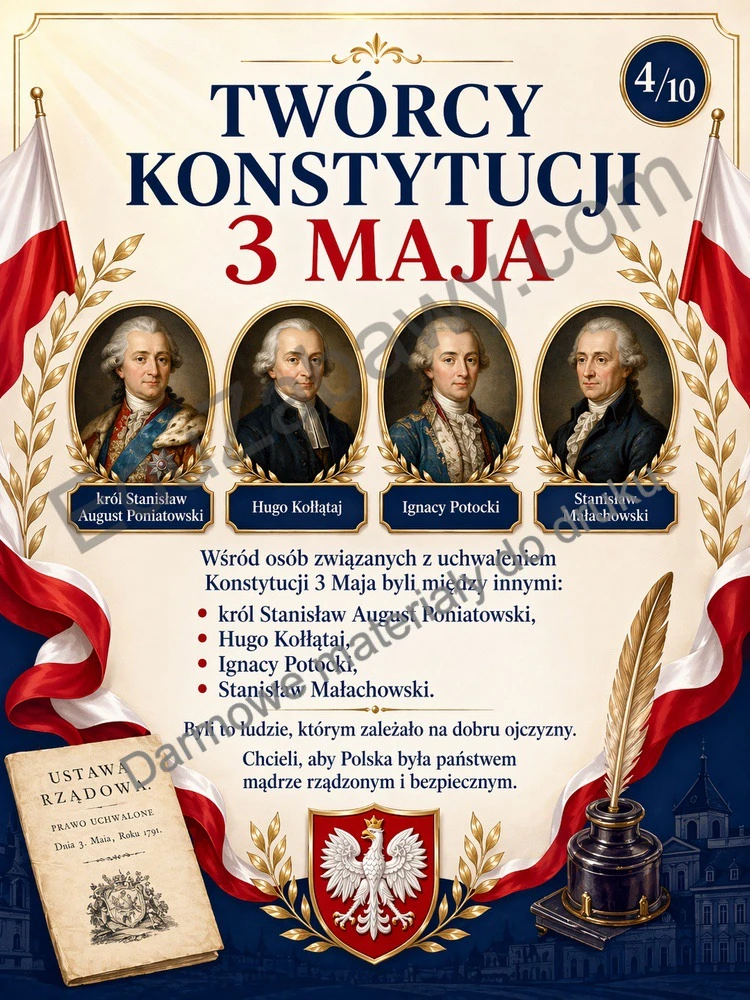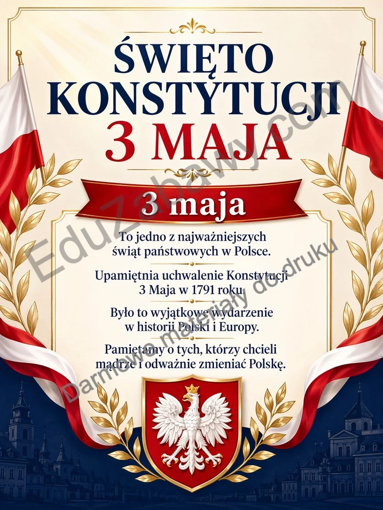 To darmowy PDF do druku, gotowy do wykorzystania podczas szkolnych obchodów 3 maja.
