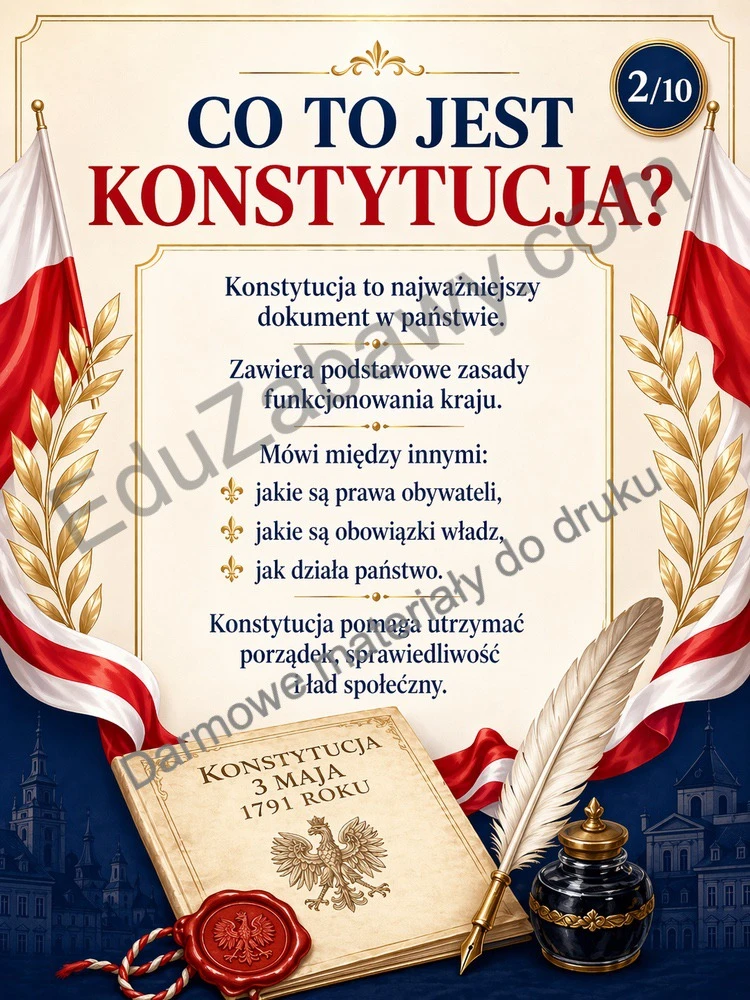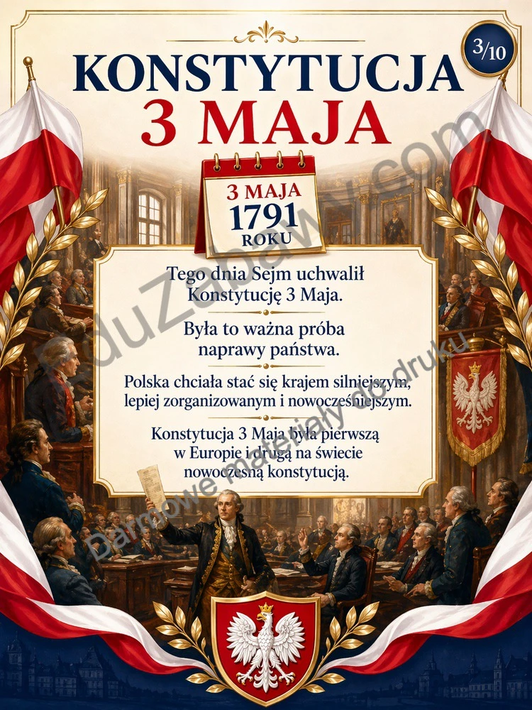 Darmowa gazetka szkolna na 3 maja do druku w PDF to zestaw plansz edukacyjnych o Konstytucji 3 Maja, historii Polski, patriotyzmie i święcie narodowym. Materiał pomaga w prosty i uporządkowany sposób przybliżyć uczniom znaczenie tego ważnego święta.