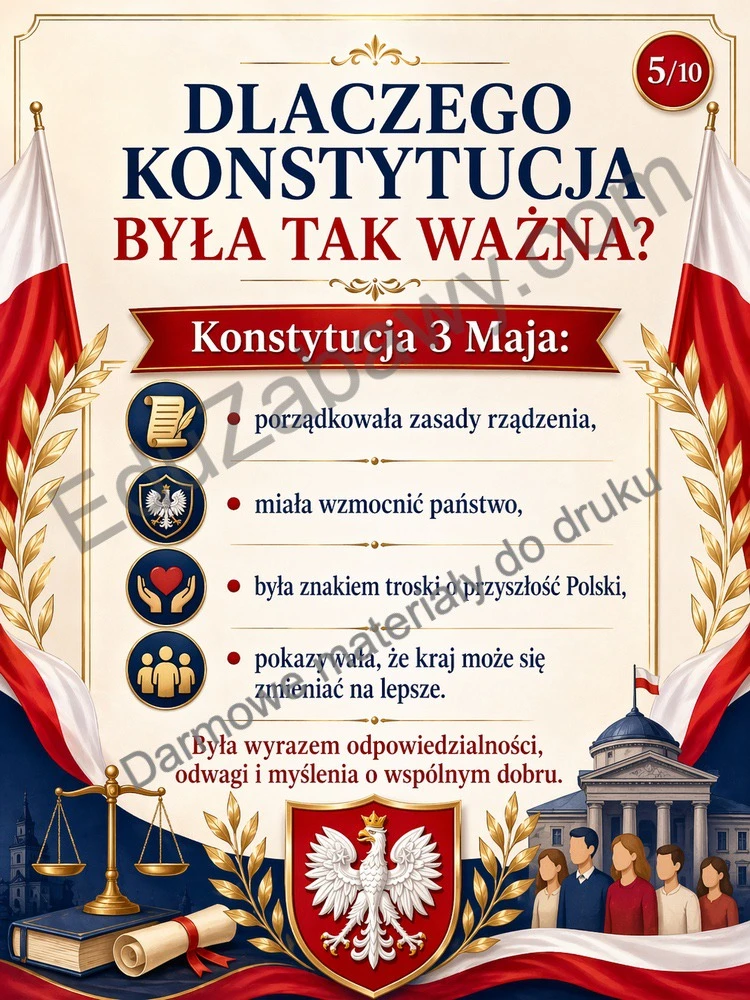 Plansze mogą pomóc wyjaśnić, czym była Konstytucja 3 Maja, dlaczego była tak ważna w historii Polski i jak dziś rozumiemy patriotyzm oraz znaczenie świąt narodowych. Zestaw sprawdzi się zarówno w klasach młodszych, jak i starszych jako dekoracja i pomoc dydaktyczna.