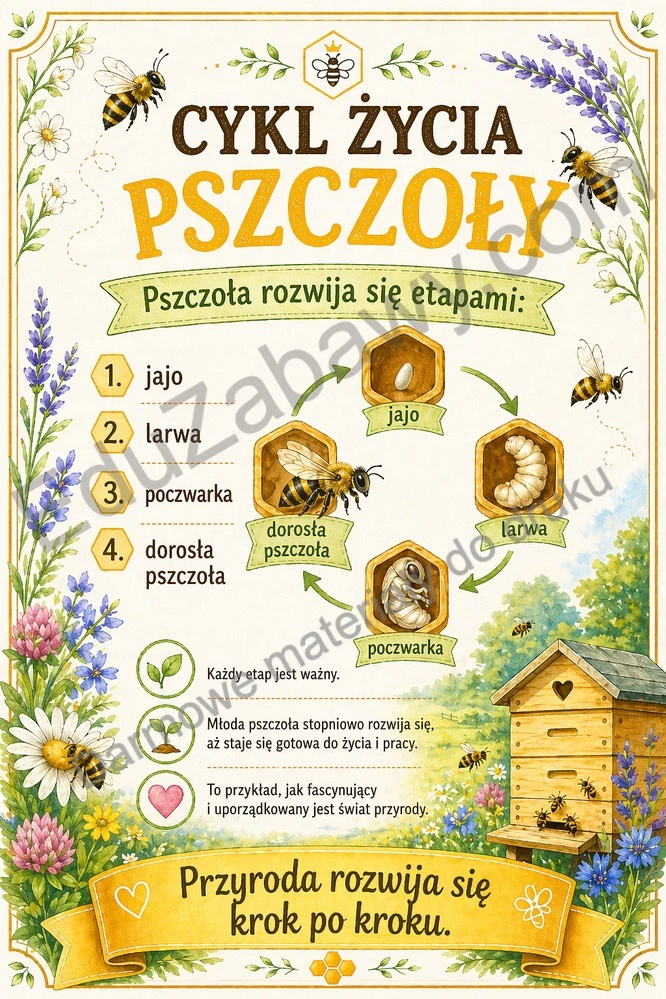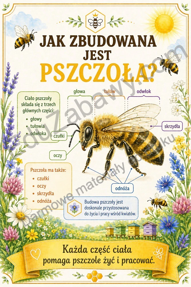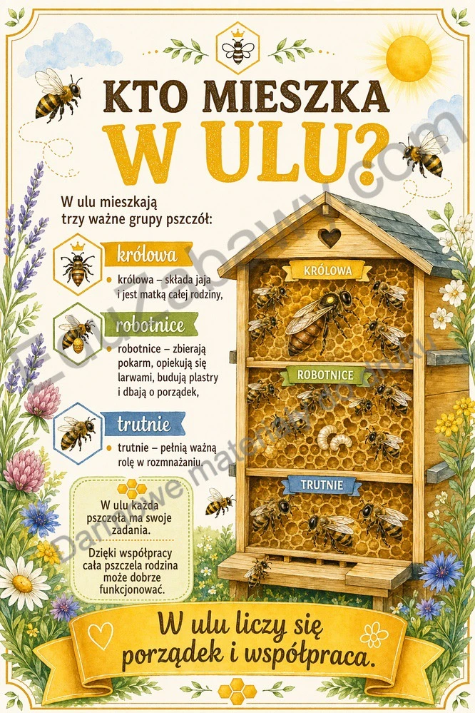 W zestawie znajduje się 10 plansz edukacyjnych, które w przystępny sposób wyjaśniają, kim jest pszczoła, jak jest zbudowana, kto mieszka w ulu, jak wygląda cykl życia pszczoły, czym jest zapylanie i jak powstaje miód. W pakiecie nie brakuje też treści o zagrożeniach dla pszczół oraz prostych sposobach pomagania zapylaczom.