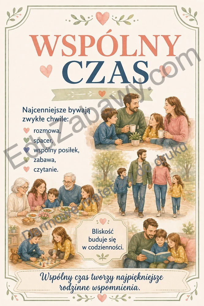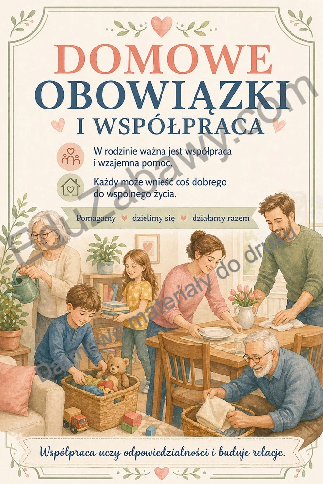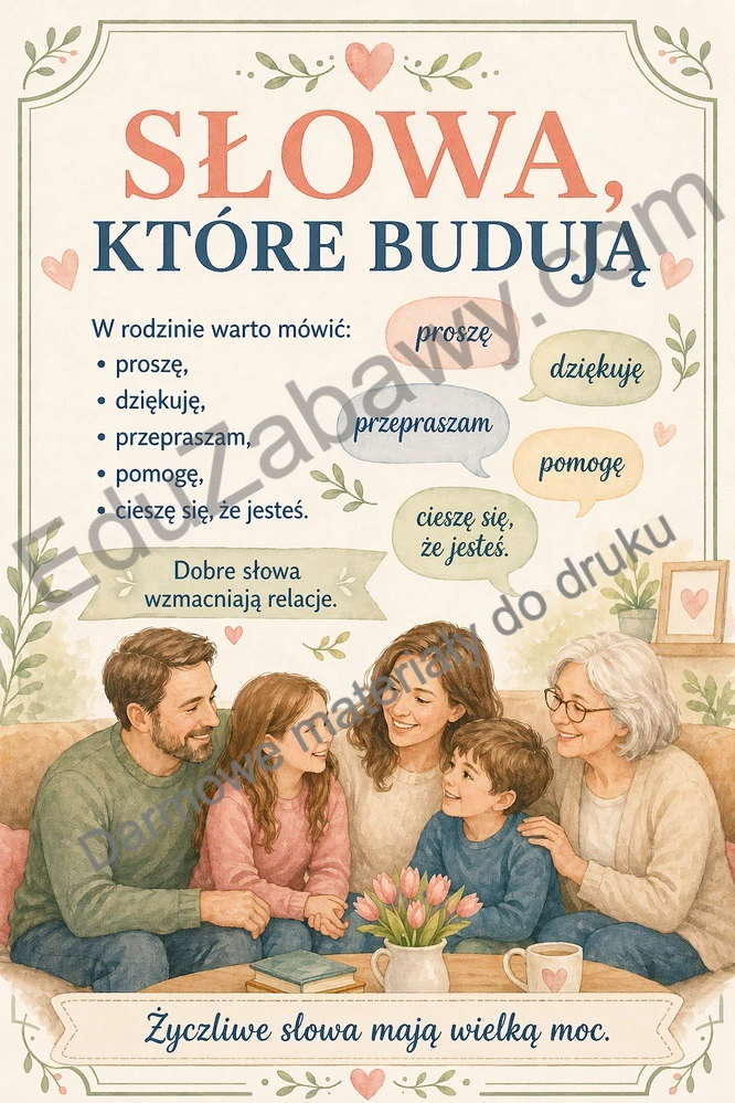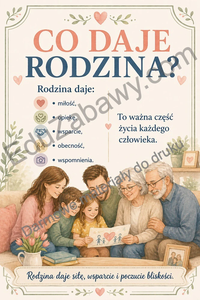 W zestawie znajdują się plansze pokazujące, co daje rodzina, jak ważne są dobre słowa, rozmowa, codzienna troska i rodzinne tradycje. To materiał odpowiedni zarówno dla młodszych, jak i starszych uczniów. Sprawdzi się podczas szkolnych obchodów Dnia Rodziny, zajęć wychowawczych oraz rozmów o emocjach i więziach.