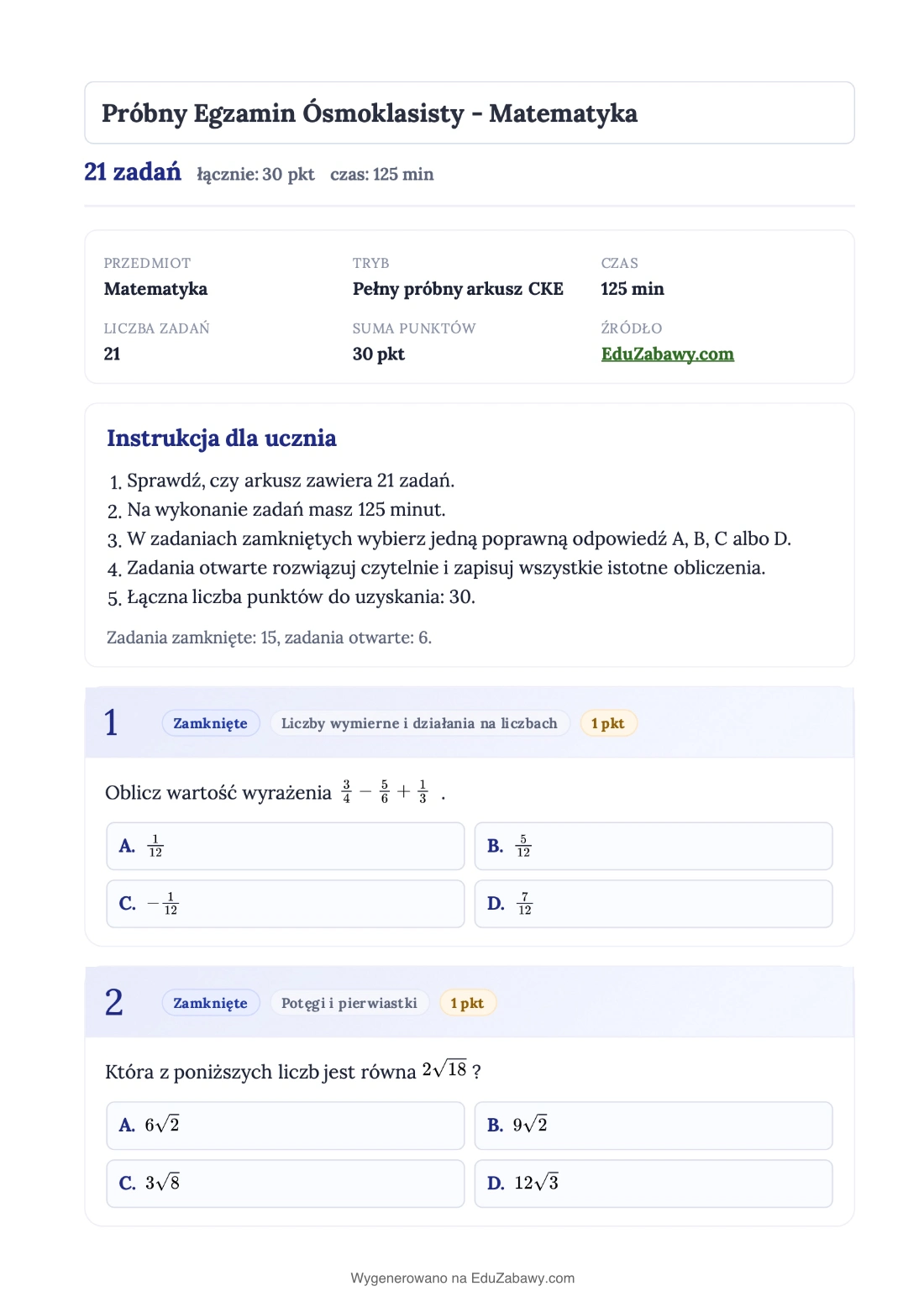 Nasz Generator Arkuszy z AI pozwala tworzyć kompletne arkusze egzaminacyjne w stylu CKE – dokładnie takie, jakie uczniowie znają z oficjalnych egzaminów.