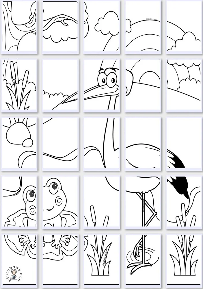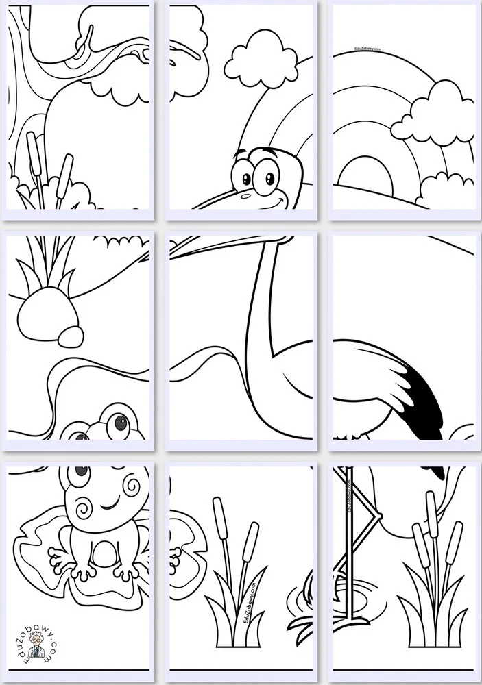 Wiosenna malowanka dla dzieci do druku. Śliczny obrazek na którym znajduje się łąka wraz ze stawem, w stanie siedzi wesoła i uśmiechnięta żabka, obok niej na jednej nodze stoi bocian który wesoło się uśmiecha. W oddali jest tęcza oraz drzewo. Pokoloruj wszystkie szczegóły tej kolorowanki podłogowej. Zwróć uwagę, że przygotowaliśmy aż 3 rozmiary, duża 9 kartek, bardzo duża 16 kartek i ogromna 25 kartek. Każda z kolorowanek jest poprzedzona obrazkiem na stronie A4 aby dzieci nie miały problemu z późniejszym połączeniem malowanki w jedną całość. Możesz rozdać dzieciom szablony lub podzielić dzieci na grupki. Pewnie całe są ciekawe co uda im się stworzyć. Wiosenna łąka do pokolorowania zupełnie za darmo, wydrukuj i ciesz się razem dziećmi.