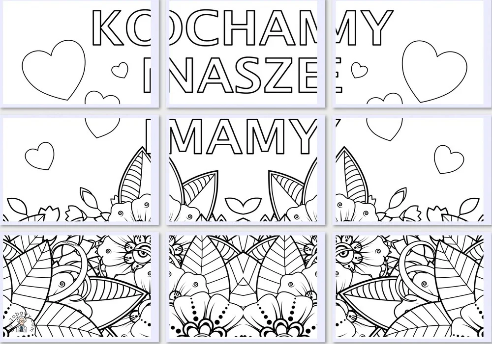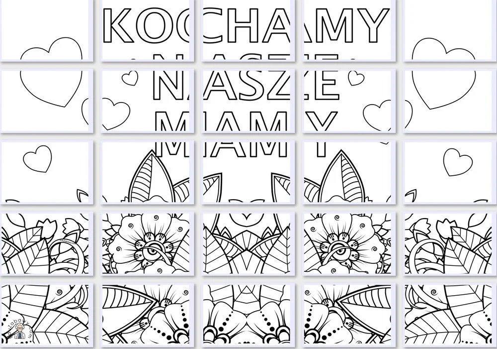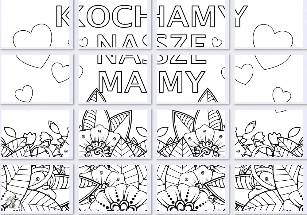 Ostatnio pytaliśmy jaką kolorowankę na Dzień Mamy chcielibyście zobaczyć na naszej stronie. Jedną z propozycji była Kochamy Nasze Mamy. Tak oto powstała ta ogromna i śliczna laurka dla wszystkich mam. Jest na niej ogromny napis, serduszka oraz mnóstwo kwiatów. Dzieci kolorując ten obrazek wiedząc że będzie to dla ich mamy włożą w to całe swoje serce. Jesteśmy niemal pewni, że mamy będą wzruszone. Laurka dla mamy może być wydrukowana w rozmaicie A4, jednak aby robiła jeszcze większe wrażenie możecie skorzystać z możliwości drukowania w rozmiarze XXL, i tu już trzy opcje do wyboru. 9, 16 oraz 25 kartek. Nie wiemy czy macie tyle miejsca na swoich gazetkach jednak pokolorować na podłodze tak ogromny rysunek to będzie nie nada wyzwanie. Szablon jest oczywiście bezpłatny, korzystajcie śmiało a jeśli macie ochotę podeślijcie nam zdjęcie pokolorowanej już pracy. Jesteśmy bardzo ciekawi efektu.