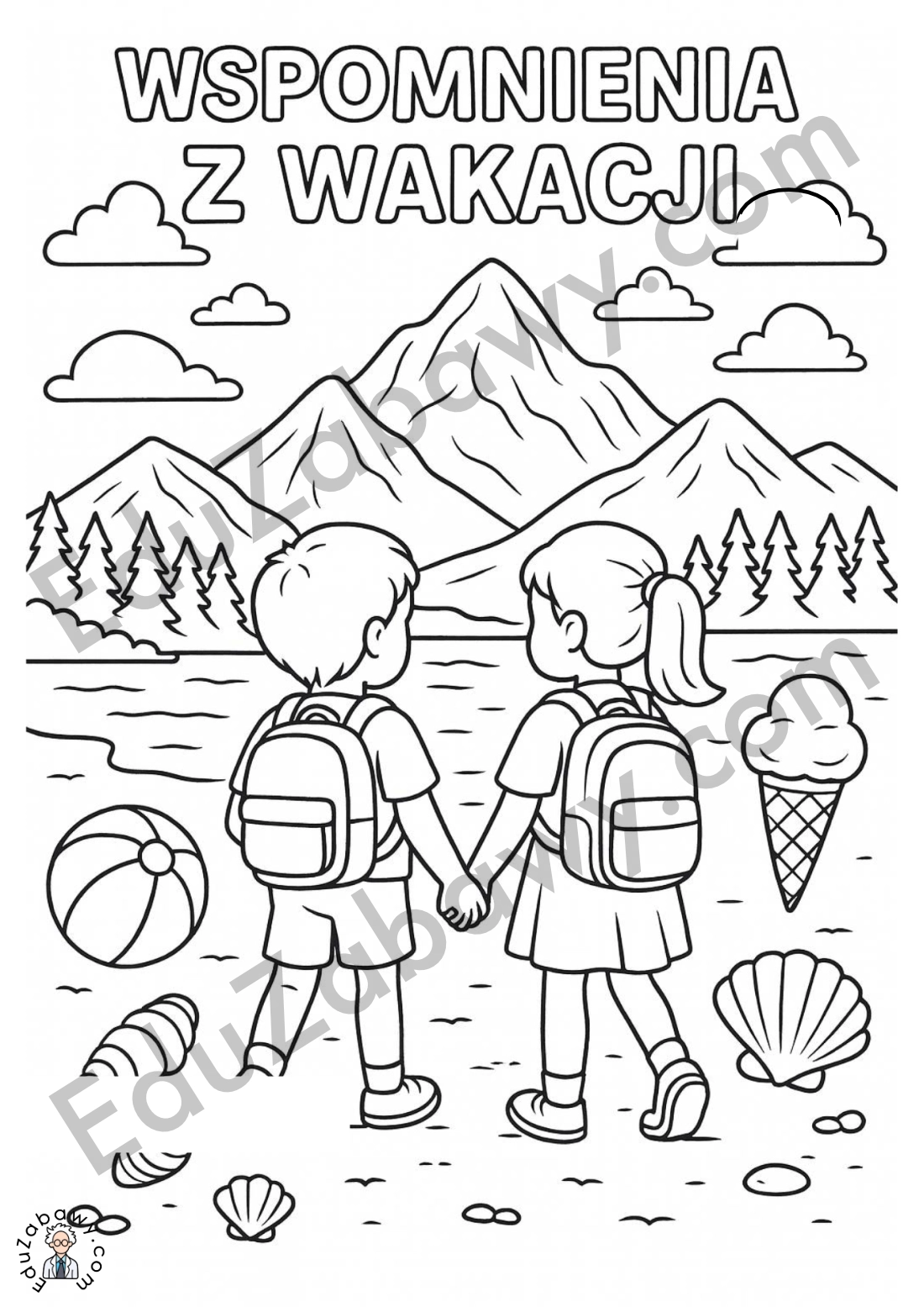 Kolorowanka „Wspomnienia z wakacji” przedstawia dwoje dzieci spacerujących nad wodą z plecakami, otoczonych wakacyjnymi symbolami: piłką plażową, muszlami i lodami. W tle widoczne są góry, chmury i drzewa, co daje wiele możliwości do kolorowania i pobudza dziecięcą wyobraźnię.