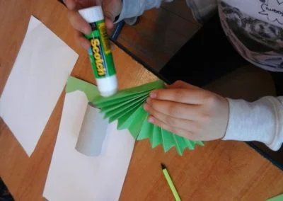 1. Tworzenie korony drzewa: Uczniowie tworzą harmonijkę z zielonej kartki papieru A4. Aby to zrobić, kartkę składają naprzemiennie, tworząc zagięcia na całej długości kartki.