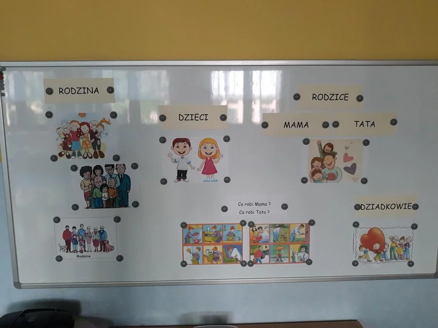 Zacznij od zaplanowania layoutu na tablicy. Zdecyduj, jakie elementy chcesz umieścić, np. sekcje dla różnych członków rodziny: rodzice, dzieci, dziadkowie, a także pytania typu „Co robi Mama?” czy „Co robi Tata?”.