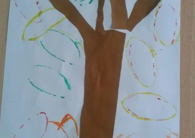 3. Rolki zanurzone w farbach były stempelkowane na kartce, tworząc jesienną koronę drzewka.
