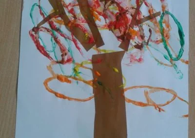 Praca jest pełna dynamizmu i kolorów, co odzwierciedla bogactwo i różnorodność jesieni. Takie ćwiczenia są nie tylko zabawą, ale także wprowadzają dzieci w świat sztuki i natury, ucząc ich, jak za pomocą prostych materiałów można stworzyć coś unikalnego i wyrazistego.