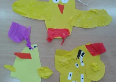 – Najpierw naklejane są skrzydełka na ciało kurczaczka, potem oczy i dziób. Nóżki są przyklejane na spodzie ciała kurczaka.