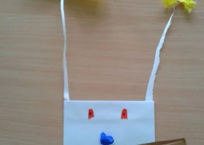 – Z białego papieru dzieci wycinają kształty uszu, które następnie przyklejają do górnej części koperty.