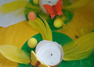 Klejem magik dzieci kleją styropianowe jajeczka i piórka.do środka wkładamy podkłady świeczki (pokrojone nożem), druga stronę podkładki oklejanie biała kartką