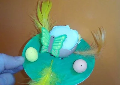 – Dzieci mogą teraz użyć kleju do papieru (np. Magic) do przyklejania małych styropianowych jajeczek i piórek wokół wydmuszki, tworząc ozdobny wieniec.