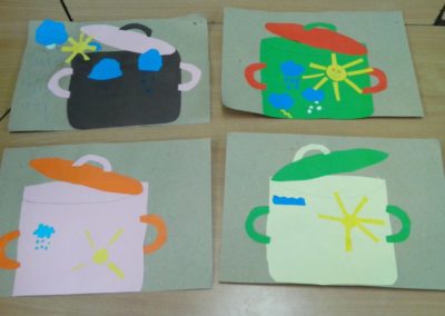 Przedstawiamy kreatywną pracę plastyczną wykonaną z kolorowych papierów, które wyglądają jak garnki z pokrywkami, z różnymi wzorami pogodowymi na nich, co przypomina polskie przysłowie „W marcu jak w garncu”, odnoszące się do zmiennej pogody w marcu. Projekt ten może być wykonany przez dzieci jako część zajęć edukacyjnych lub zabaw.