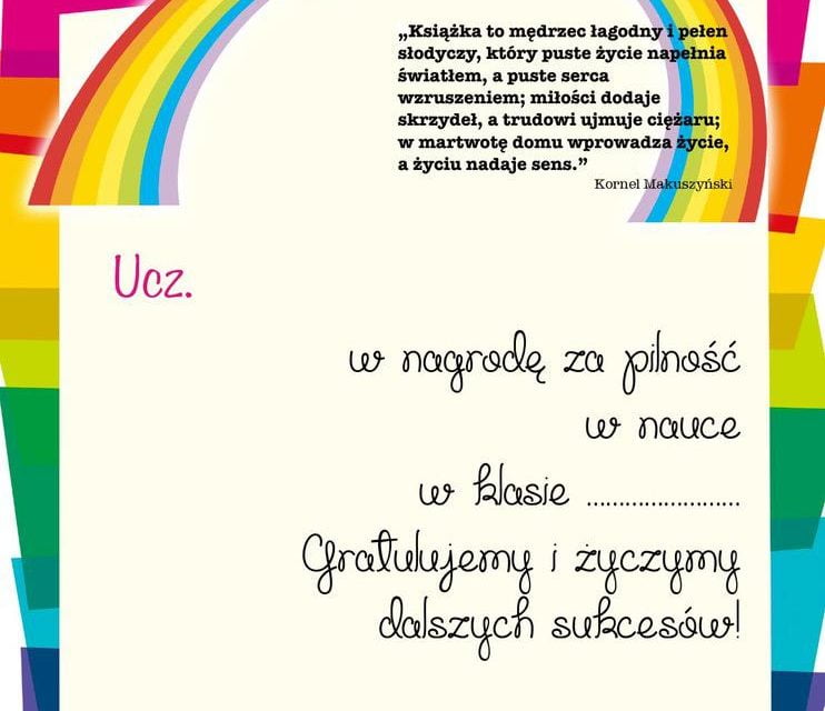 Wybierz interesującą Cię wersję dedykacji lub wkładki, wydrukuj plik PDF, a następnie uzupełnij go danymi ucznia. Wszystkie nasze wzory są uniwersalne i nadają się do personalizacji, co pozwala na dopasowanie ich do indywidualnych osiągnięć. Dedykacje sprawdzą się zarówno w szkołach, na akademiach, jak i w domowym zaciszu, gdzie rodzice mogą wyrazić swoją dumę z wyników dziecka.