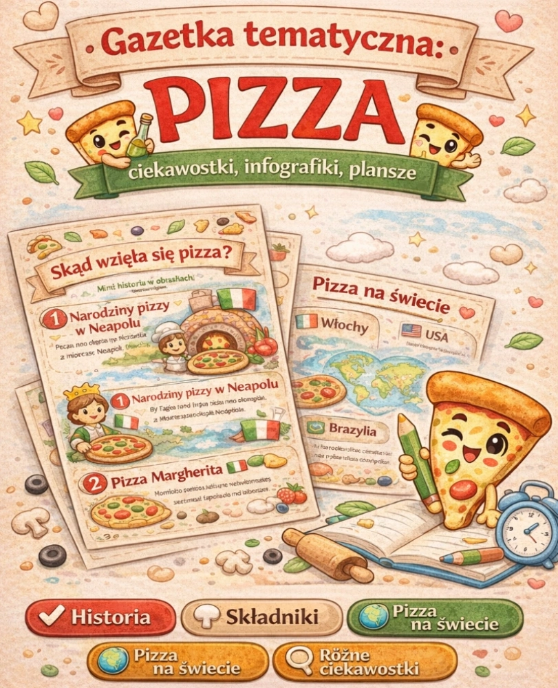 Ta gazetka tematyczna o pizzy to zestaw kolorowych plansz i infografik, które w przystępny i atrakcyjny sposób przybliżają dzieciom historię jednego z najbardziej lubianych dań na świecie.
