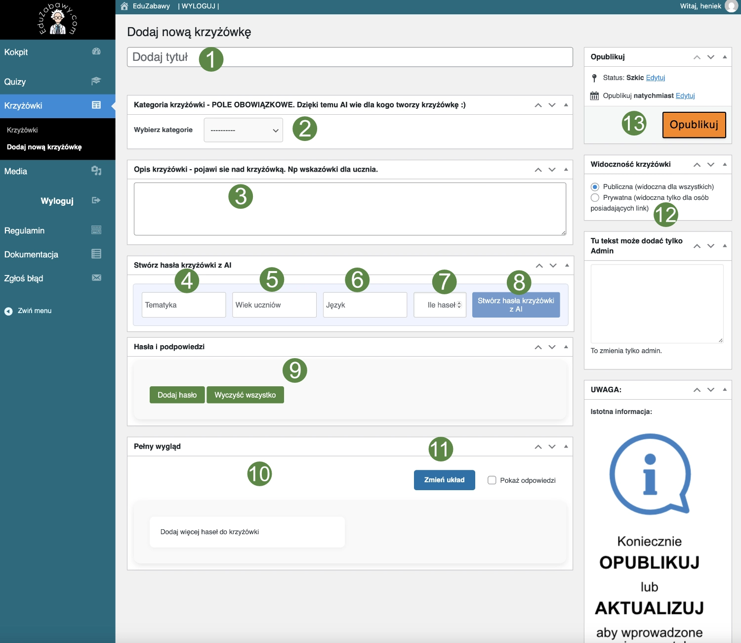 - Kategoria krzyżówki - pole obowiązkowe - bez tego nie można opublikować krzyżówki. Dzięki temu usystematyzujemy i podzielimy zbiór wszystkich krzyżówek na stronie.