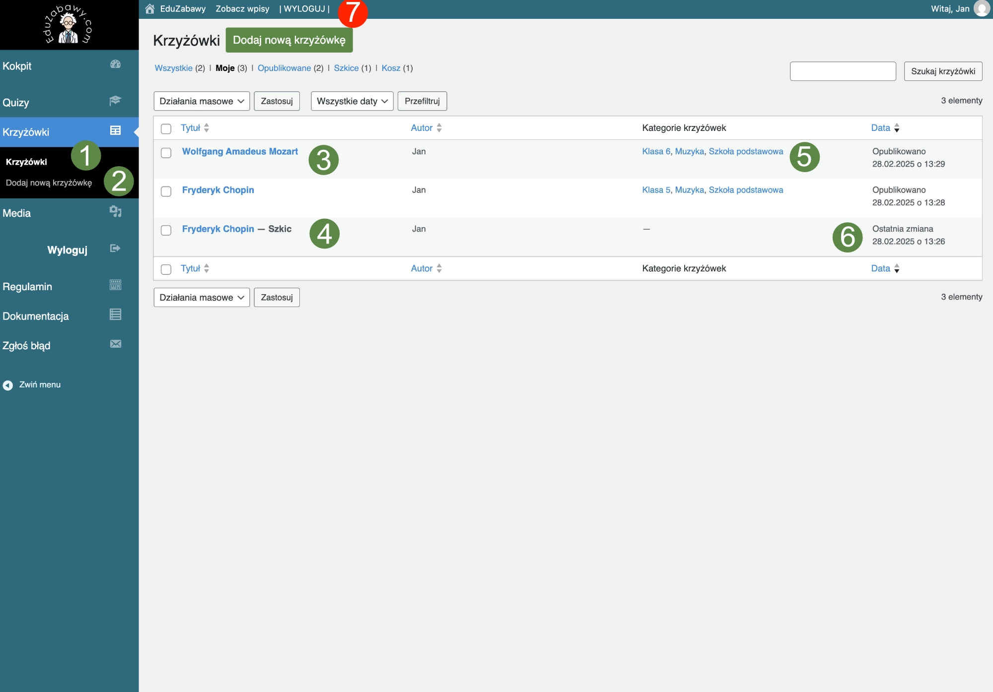- Krzyżówki – to spis wszystkich utworzonych przez Ciebie krzyżówek