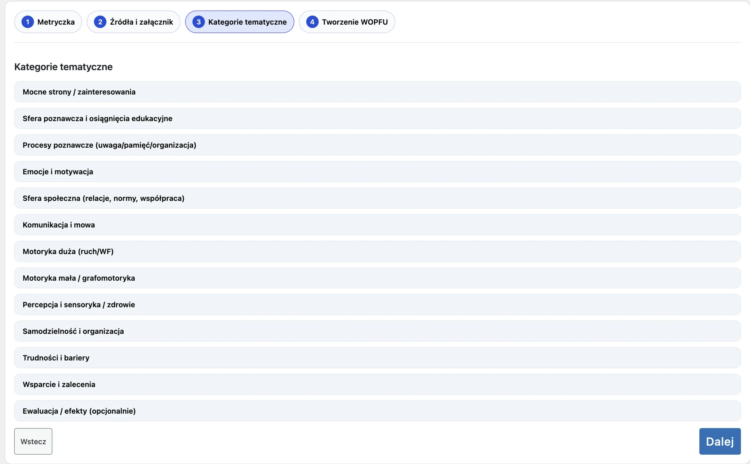 Najważniejsza część generatora to obszary funkcjonowania ucznia, uporządkowane w przejrzyste kategorie, m.in.: