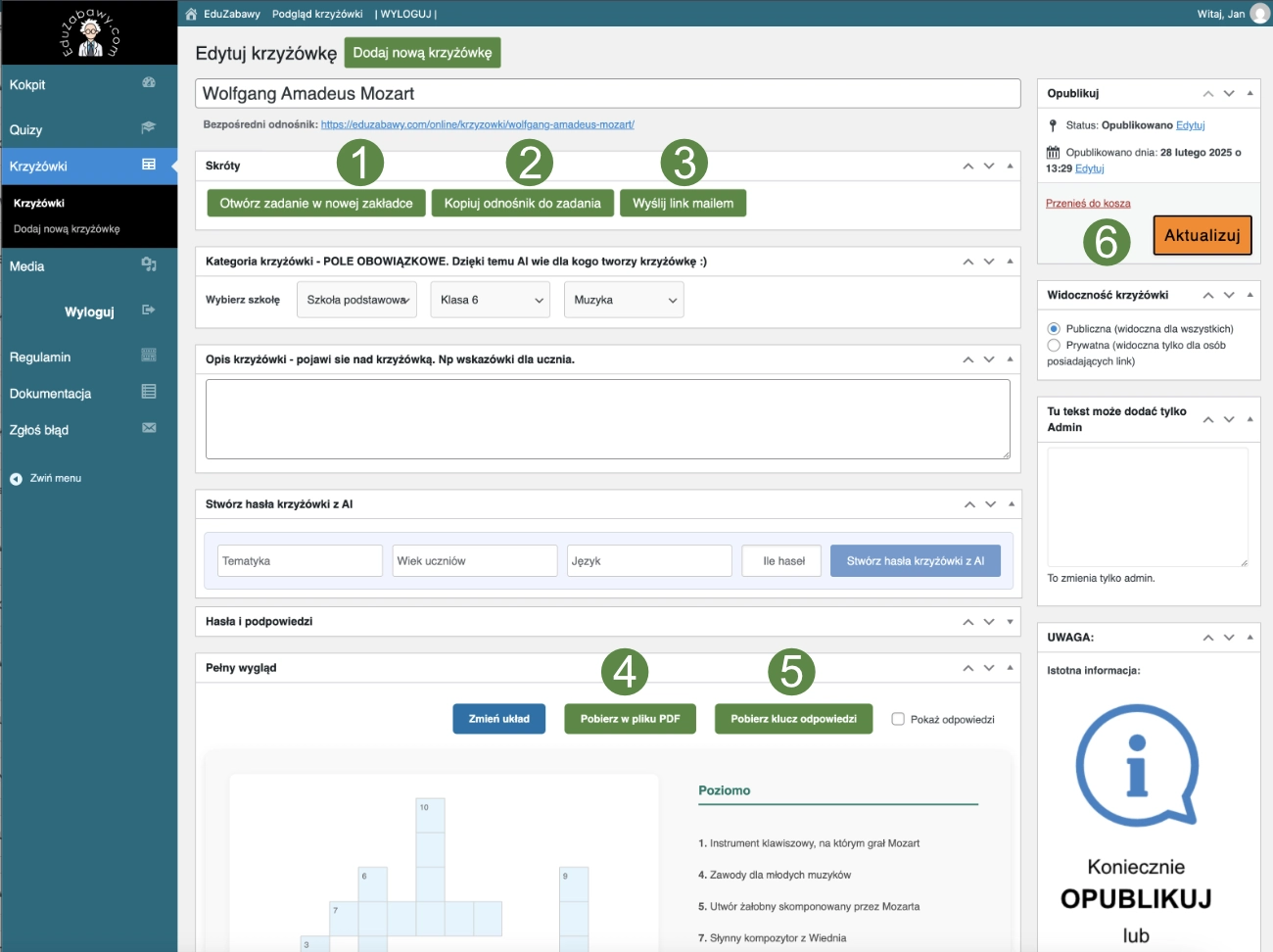 Po opublikowaniu krzyżówki pojawiają się nowe funkcje: