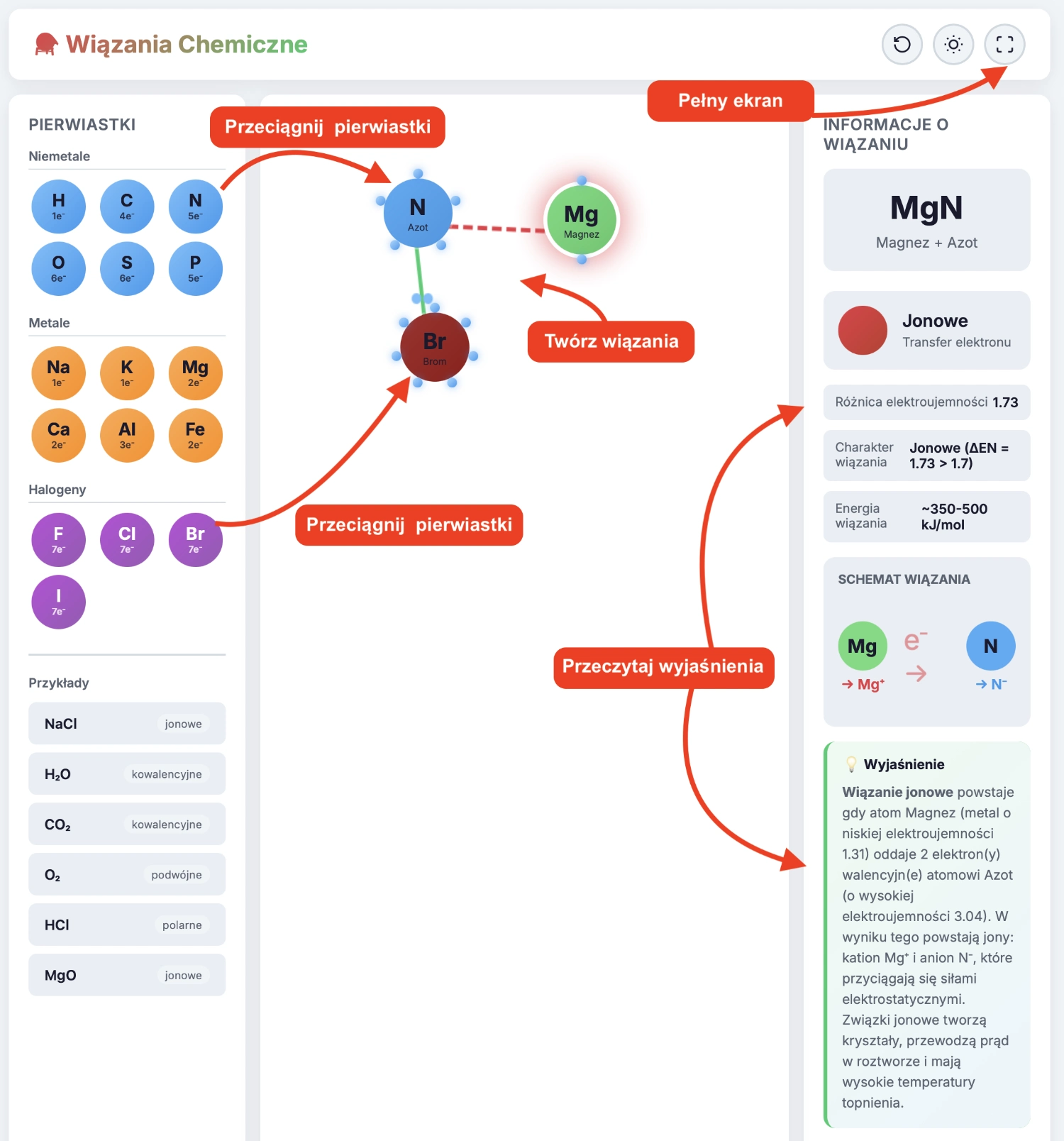 W symulacji możesz wybierać różne pierwiastki chemiczne z kilku grup, takich jak niemetale, metale czy halogeny. Po połączeniu dwóch atomów program analizuje ich właściwości i pokazuje, jaki rodzaj wiązania powstaje między nimi.